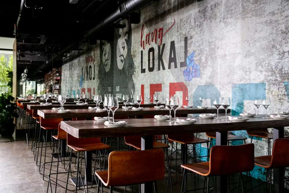 Lokal’s interiors have an industrial-chic aesthetic and large picture windows overlooking the river. The upscale-casual atmosphere extends to the outdoors, where the tables are covered by large umbrellas, allowing you to unwind in the shade.